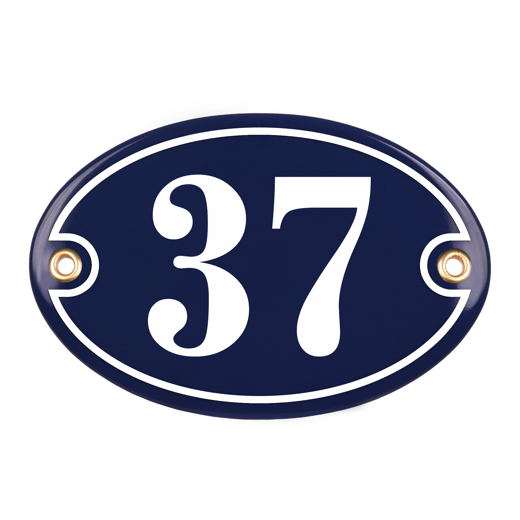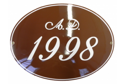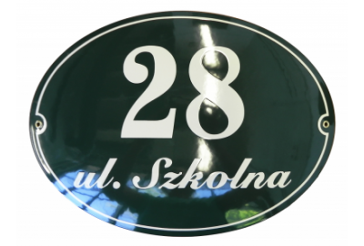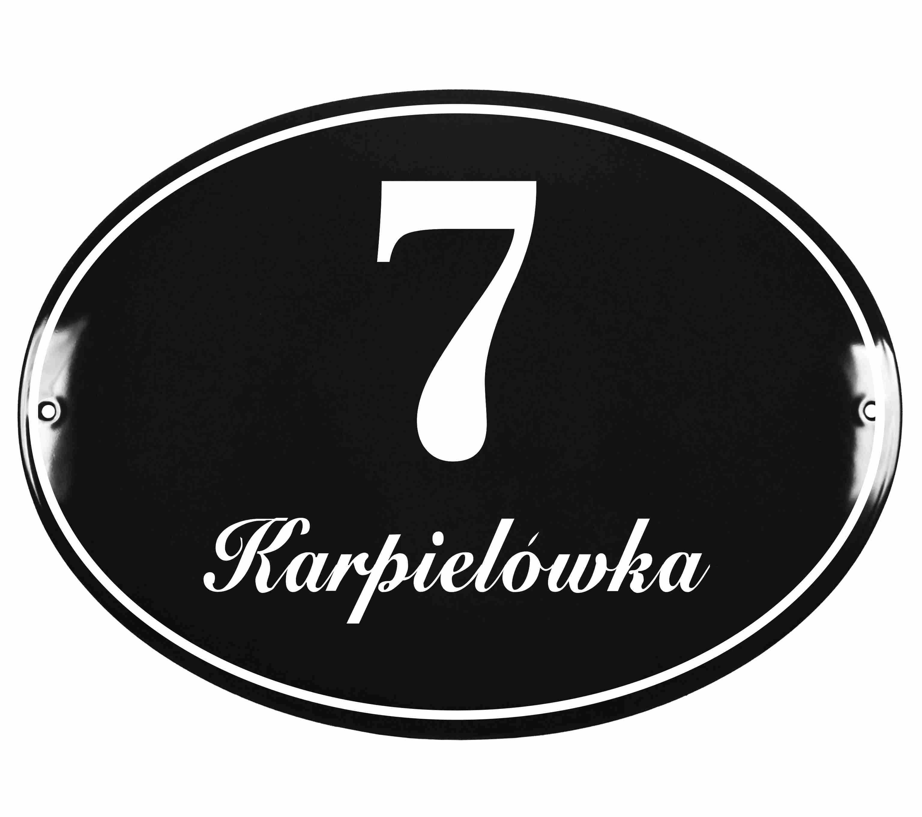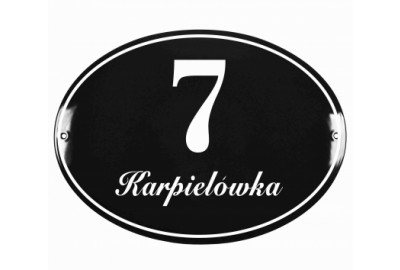 Klasyczna tablica z numerem w kształcie owalnym, metalowa, emaliowana, dwukolorowa, odporna na warunki atmosferyczne, personalizowana.