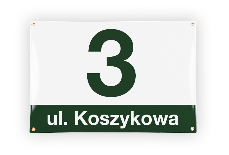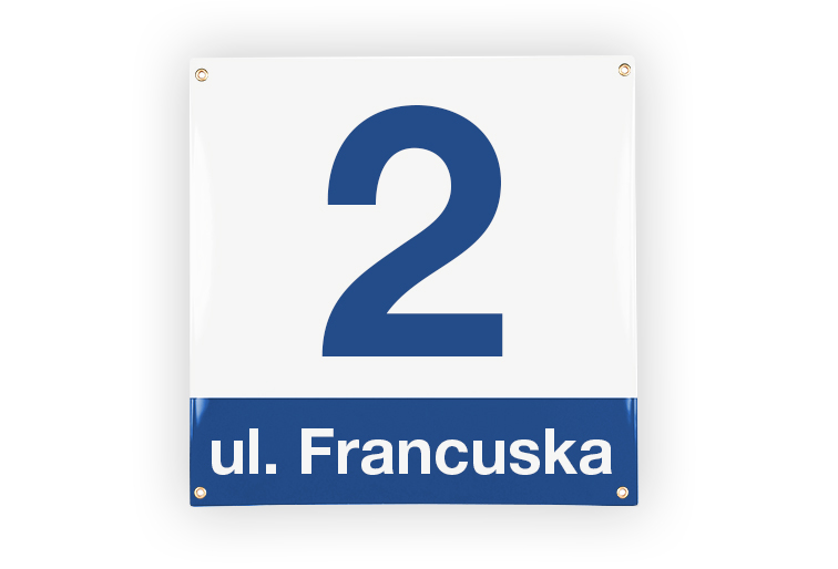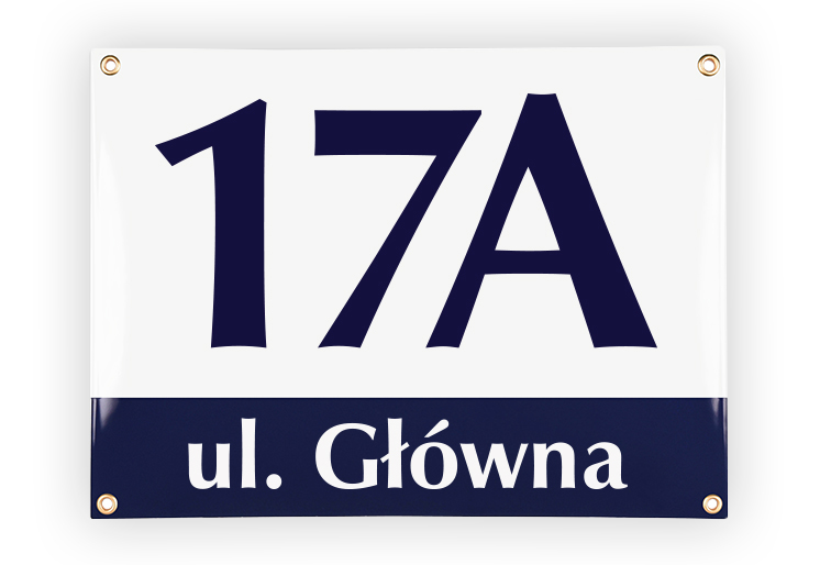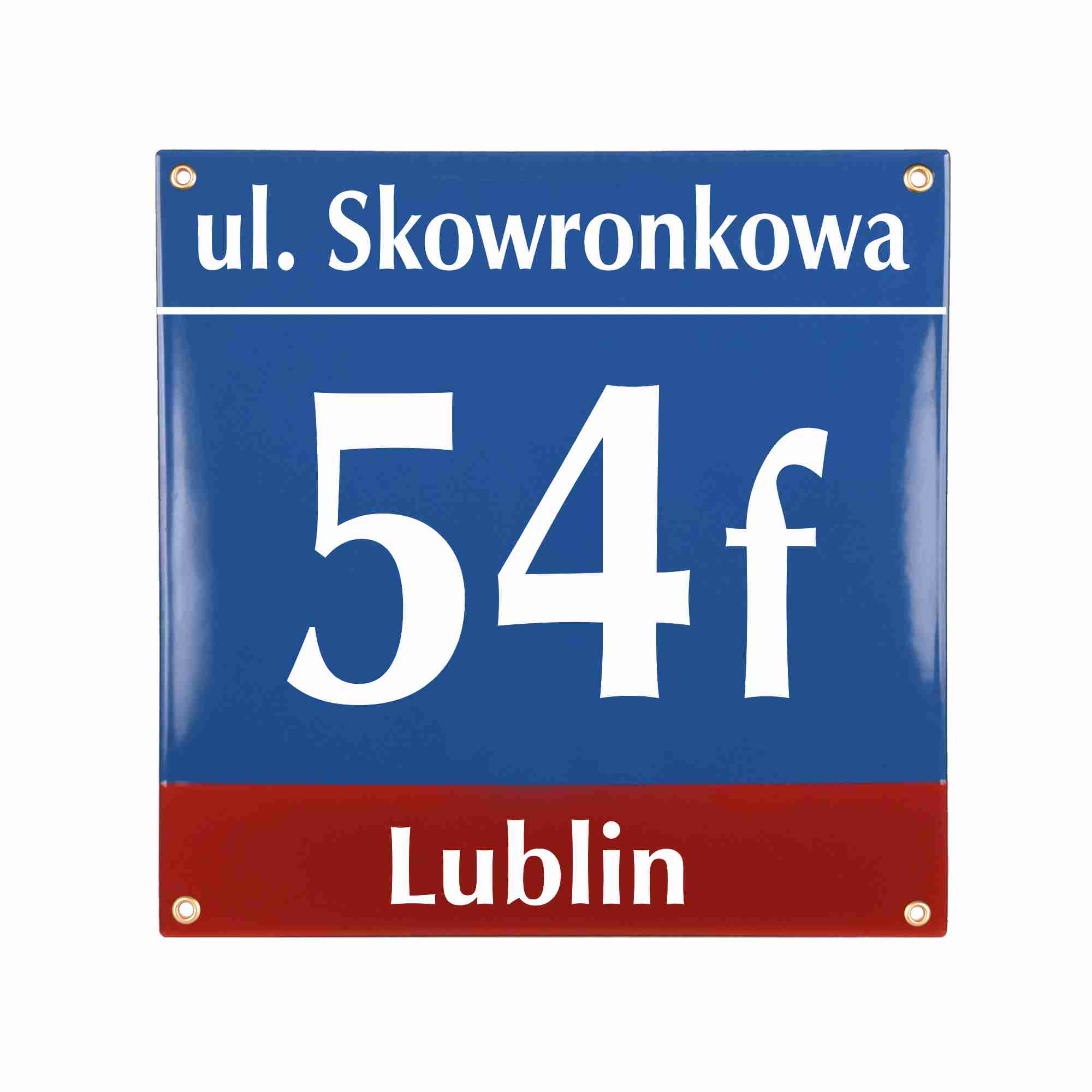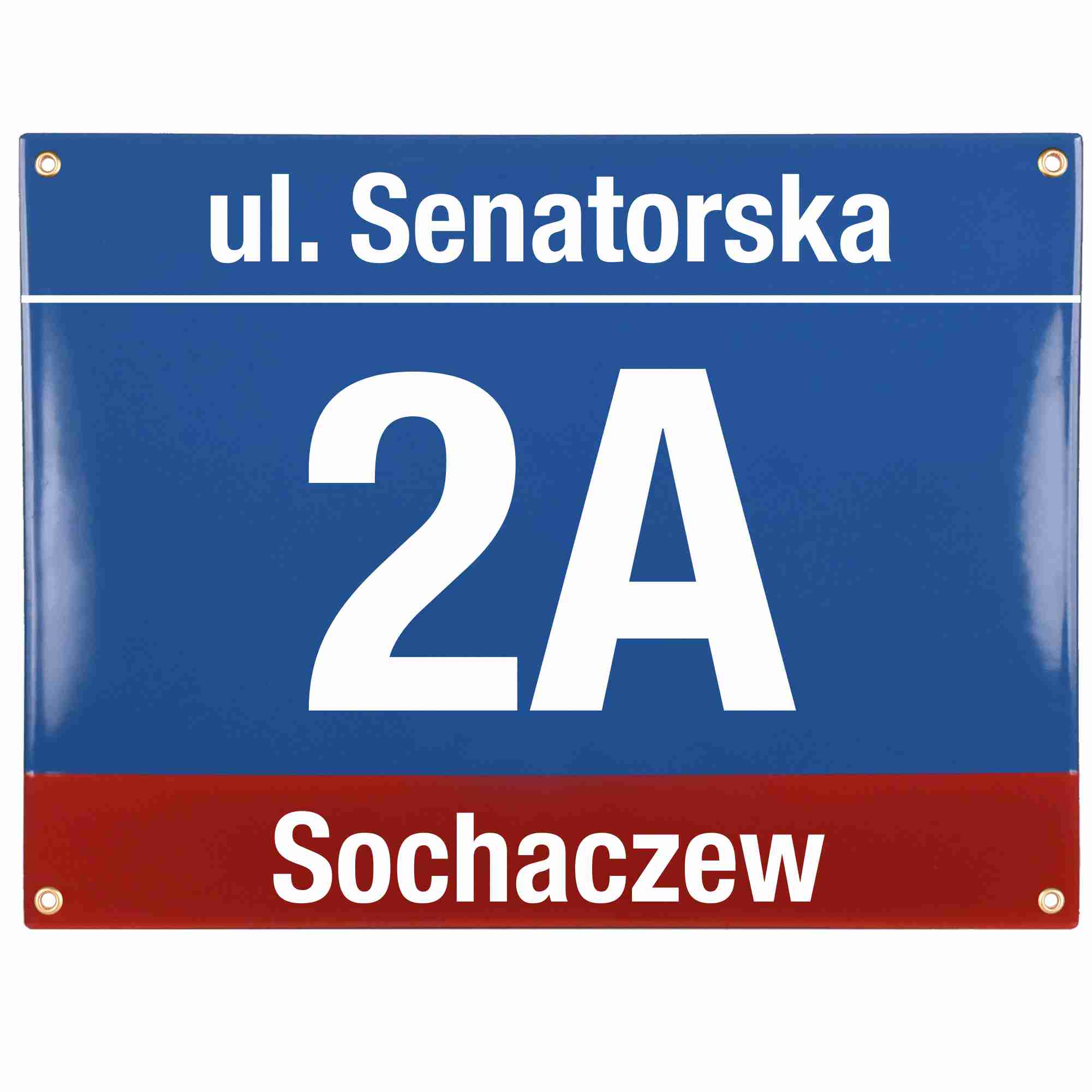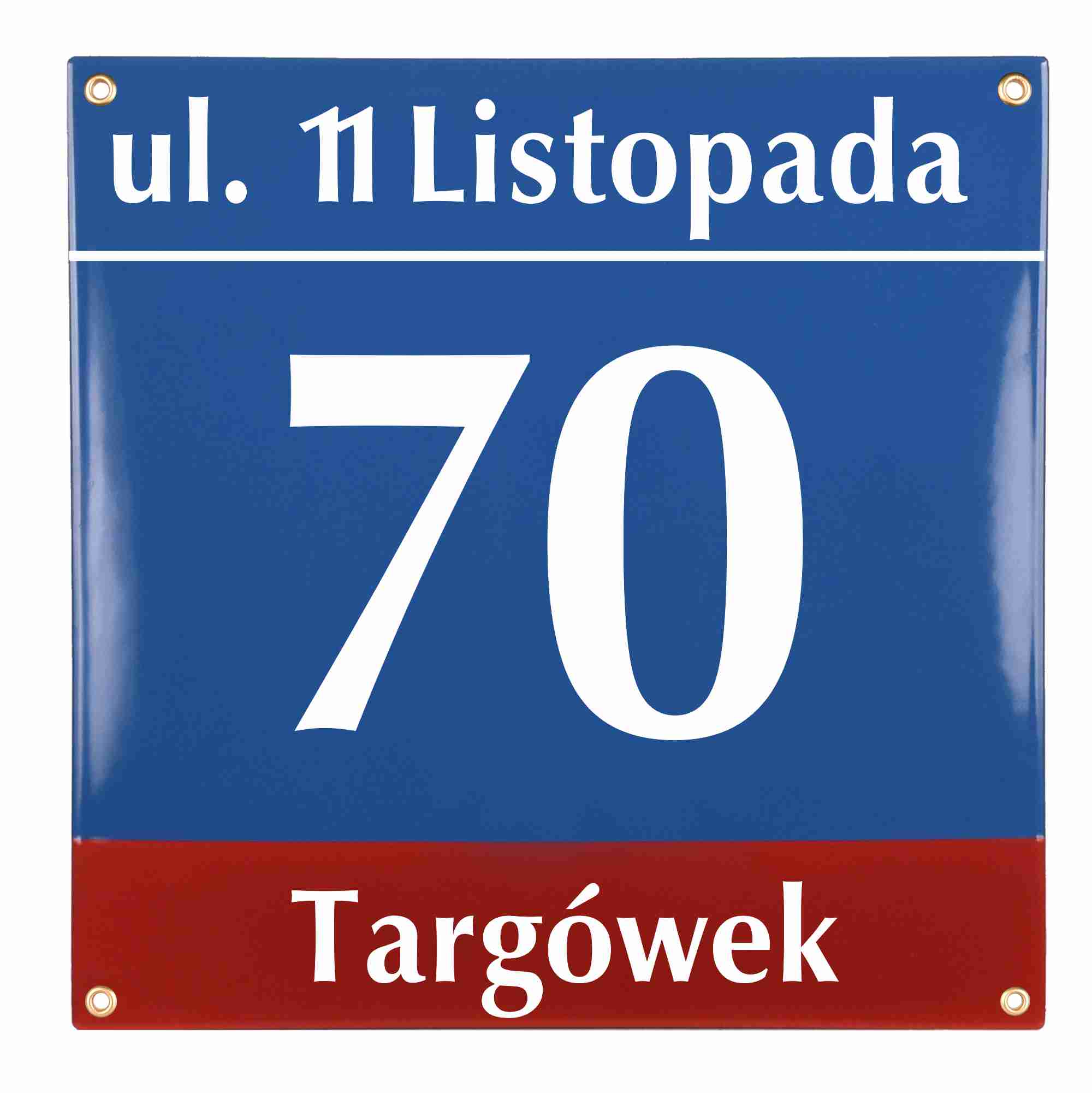 Klasyczna tablica adresowa, metalowa, emaliowana, trójkolorowa, odporna na warunki atmosferyczne, personalizowana.