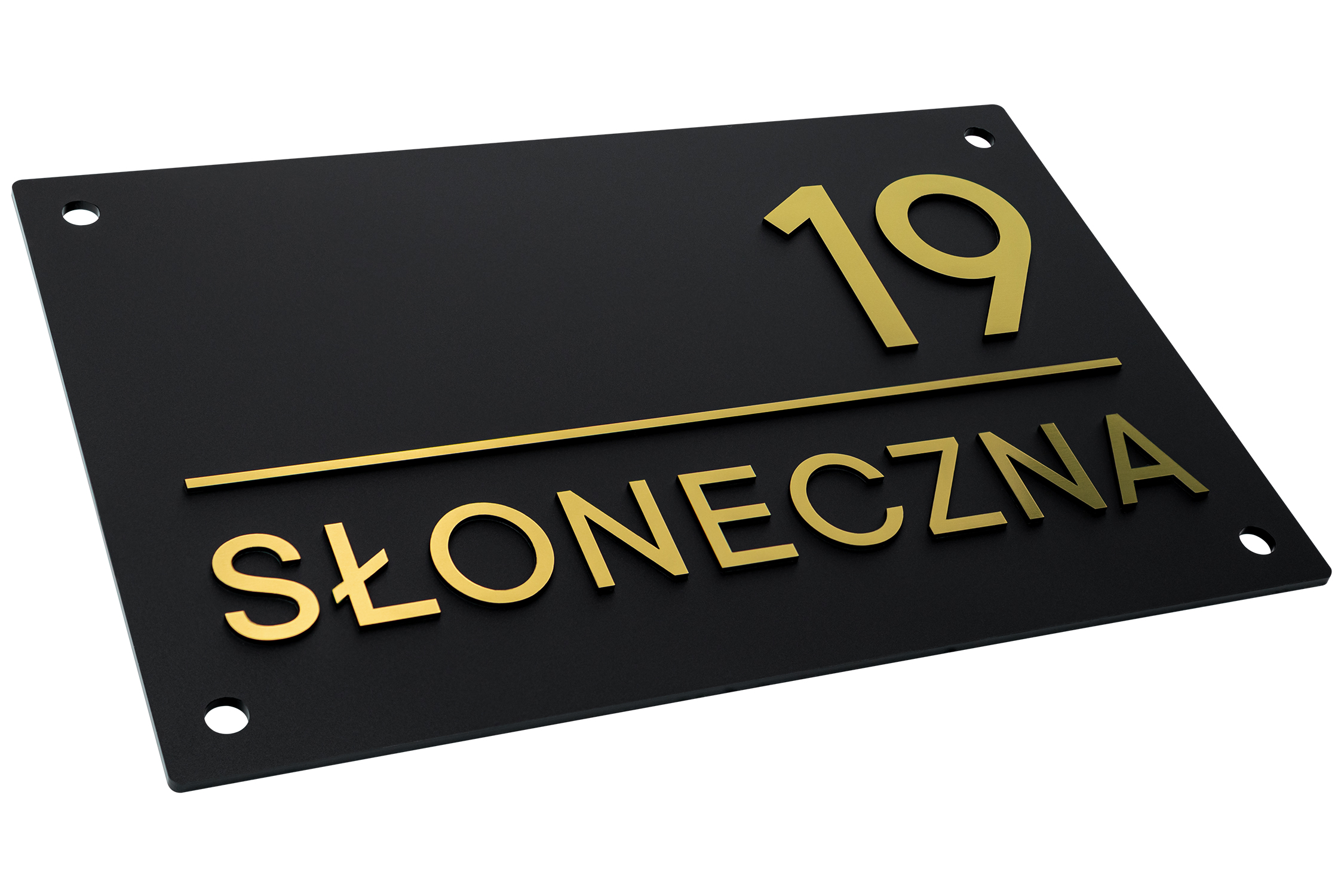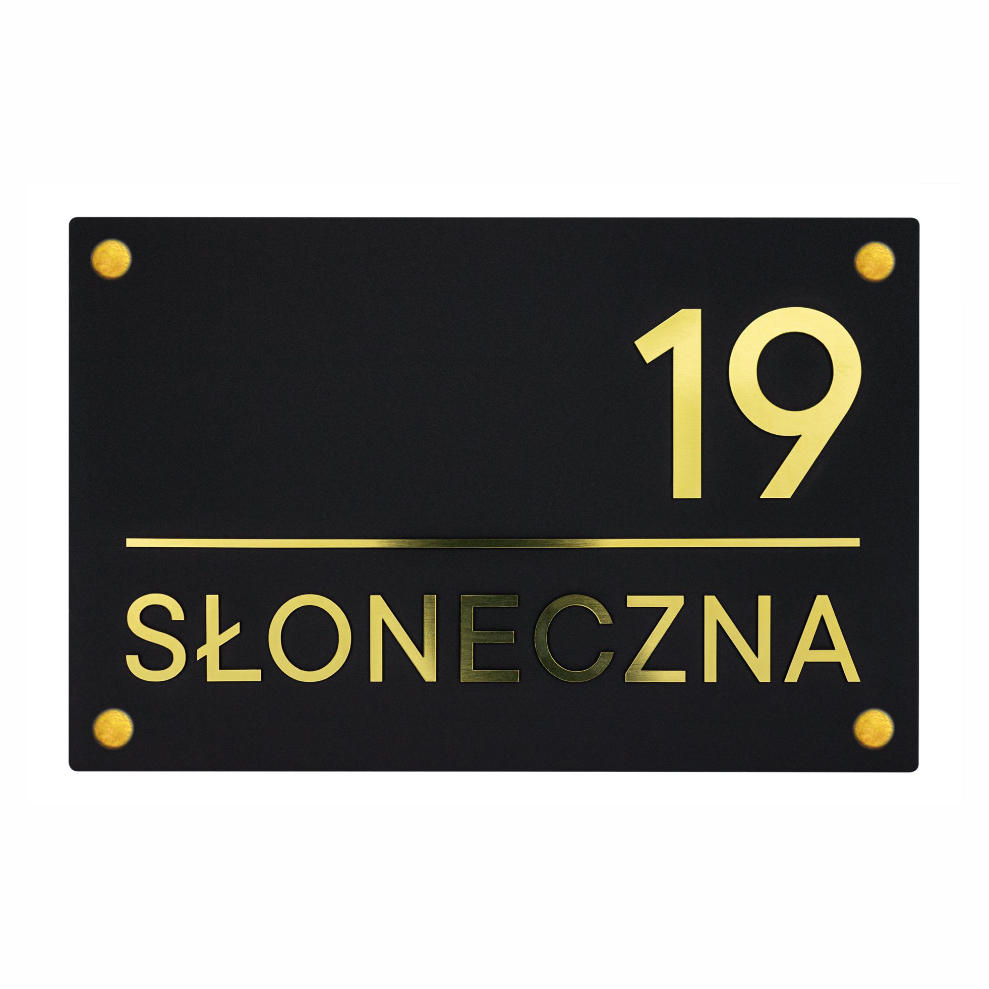 Tabliczka wykonana z plexi czarnej matowej 3 mm, literki wykonane z laminatu złotego szczotkowanego.